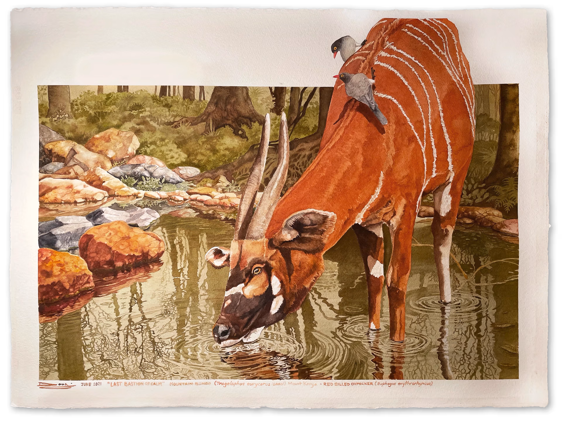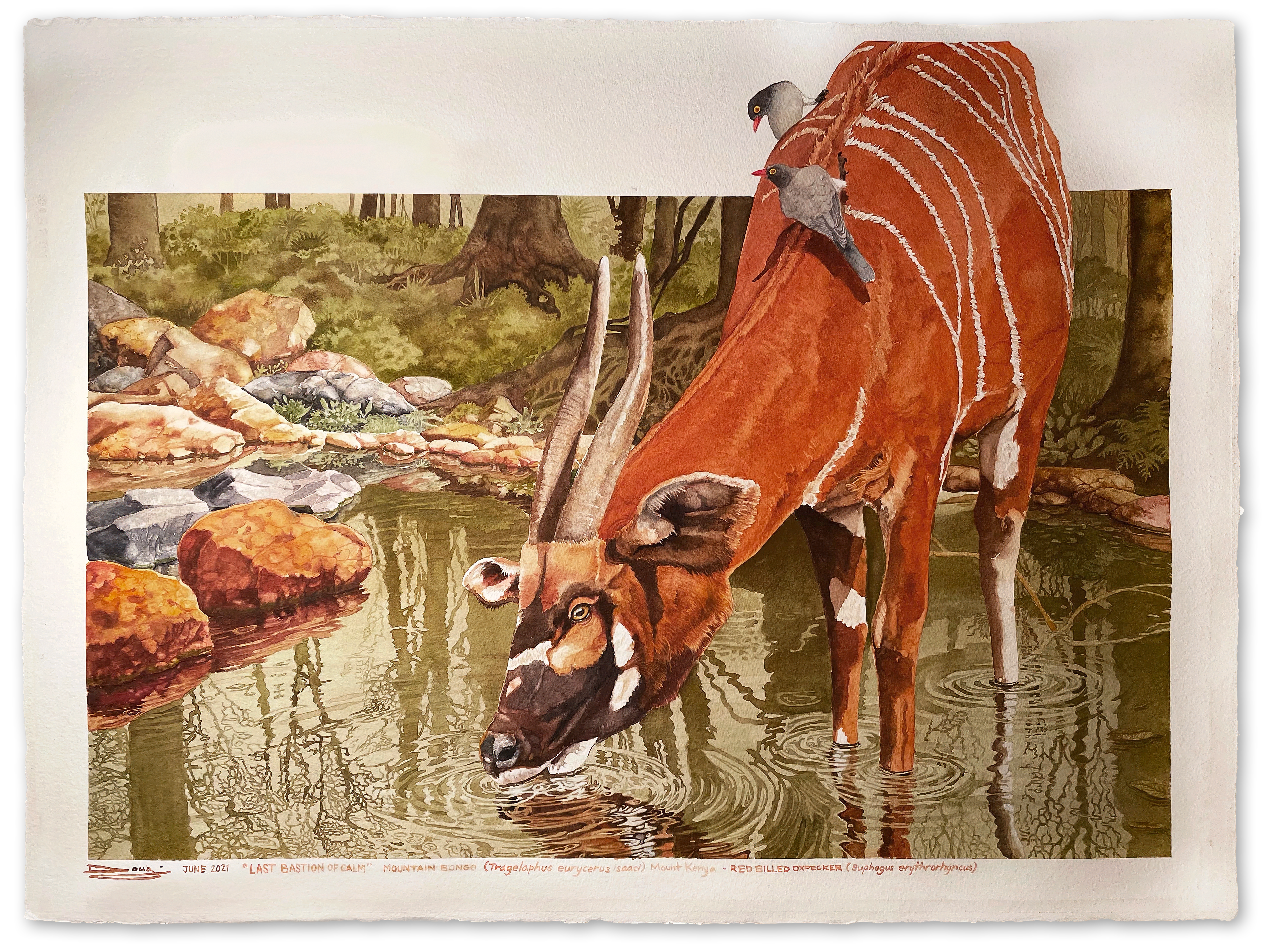 I took many photos, and used several as reference as well as finding a Mt Kenya rainforest pool image and some stock images of bongos. In the end I composited my head photo onto a stock body and added some red-billed oxpeckers. There was no reference for the ripples so I used images of grebes on lakes as the basis and just sort of worked the rest out in my head.