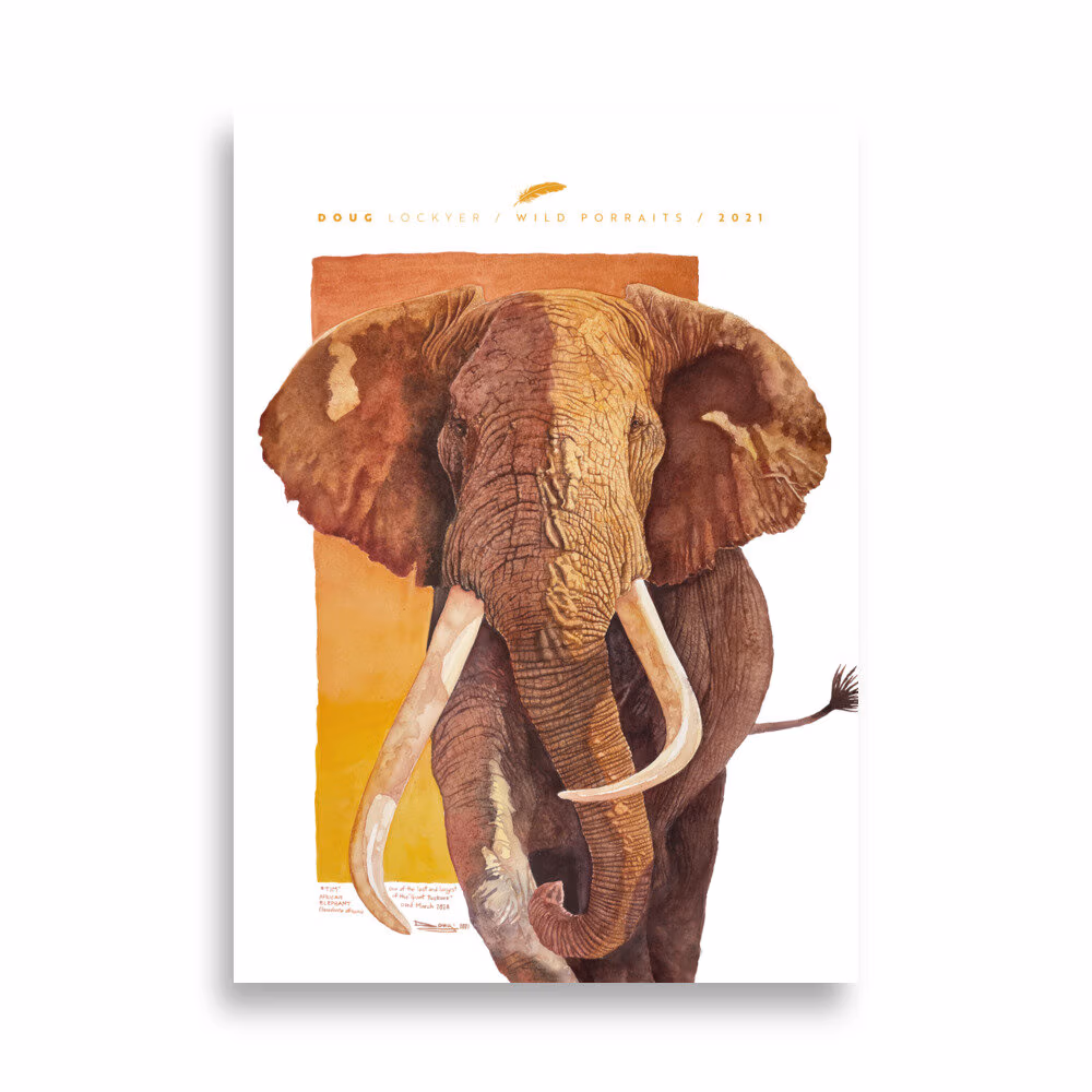 Big Tim was beloved by hundreds of thousands of people worldwide and was a major attraction at Amboseli, his home for 50 years. He was, according to Amboseli gamekeepers “intelligent, mischievous, and good-natured – a genuine gentle giant”, which I can attest to from my many hours in his company, feeding him peaches and peanuts while I sketched him.