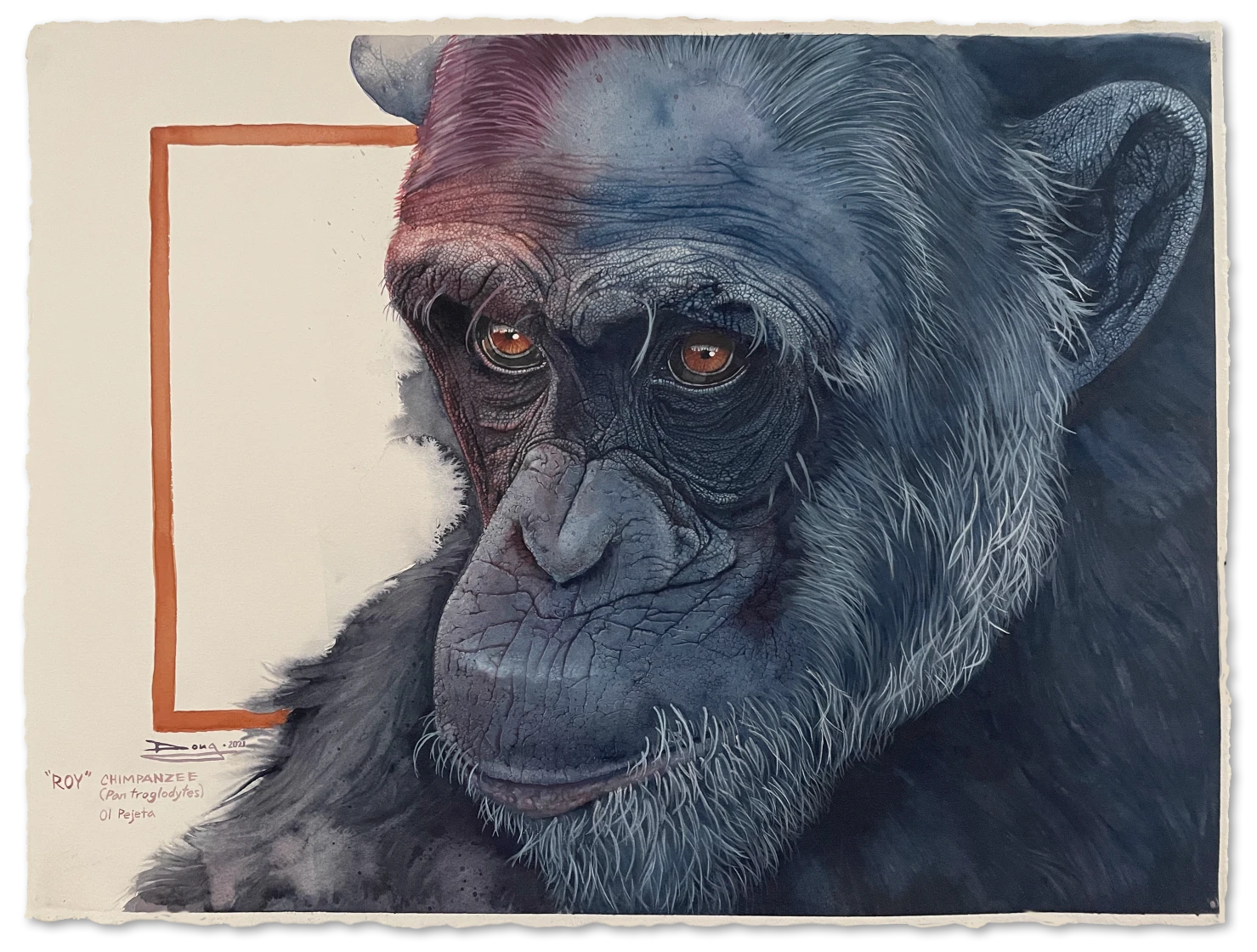 I have been planning this work since 2017, when I took the reference photo of Roy during a visit to the chimp sanctuary at Sweetwaters, operated by Ol Pejeta. Roy had been sharing food with his friend Romeo, and was enjoying a quiet moment of repose. I liked the lighting and was captivated by his pensive expression.